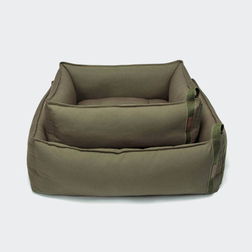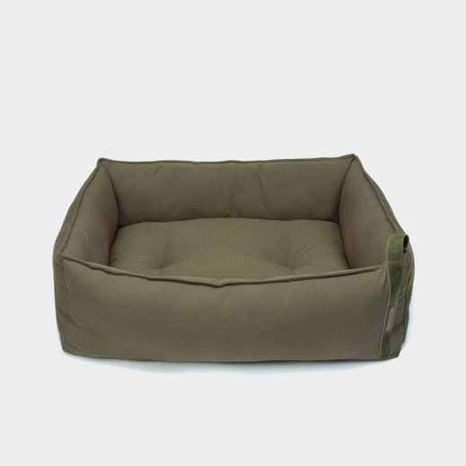 Minimalistisches Design-Hundebett in Olive aus strapazierfähigen Materialien mit umlaufendem Rand, so dass der Hund bequem den Kopf ablegen kann.